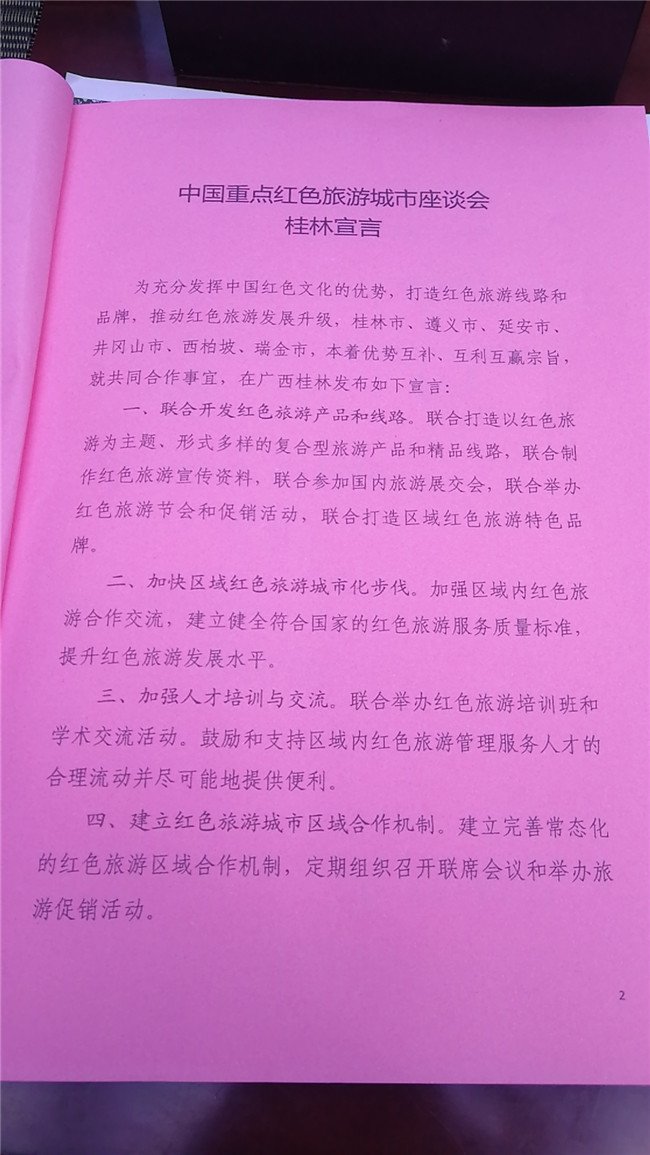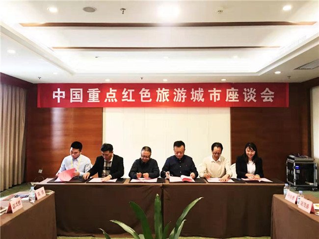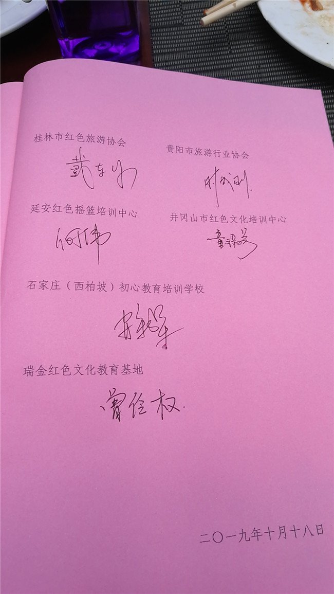 會議結束后,我校作為優選單位與桂林市紅色旅游協會、貴陽市旅游行業協會、延安紅色搖籃培訓中心、石家莊(西柏坡)初心教育培訓學校、瑞金紅色文化教育基地共同簽署“中國重點紅色旅游城市座談會桂林宣言”。