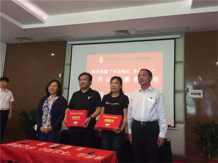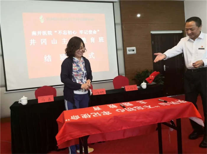 結班儀式上,天津市南開醫院泌尿外科黨支部書記柏麗莉和醫務科黨支部書記張西波兩名學員代表大家交流了學習體會,從不同角度暢談了對井岡山精神的理解,表示要在井岡山精神的激勵下,做好本職工作,救死扶傷,在平凡的崗位上誓為人民保健康!紀委馮妍書記勉勵參訓同志們要把井岡山精神轉化為服務患者發展南開的強大動力,努力拼搏,積極奮斗,將井岡精神傳承下去……并與巴特爾院長一起為培訓班學員頒發結業證書,最后所有同志們莊嚴的在班旗上簽上自己的名字,同時在內心永遠銘記下井岡山的情懷……