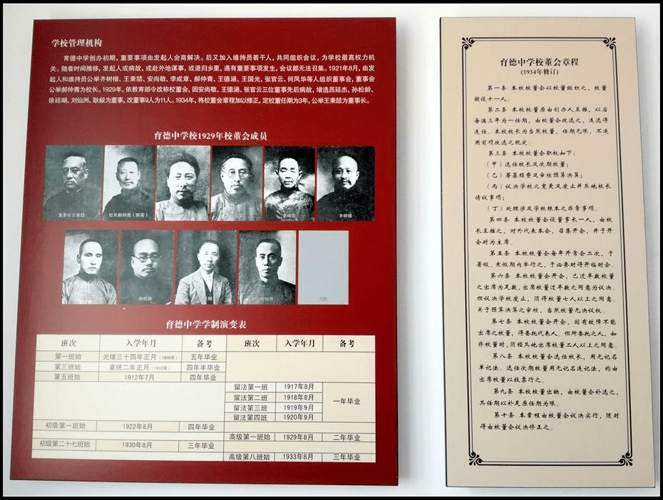 留法勤工儉學運動紀念館的主體建筑,是一座典型的清末時期磚木結構的四合院。大門(即原保定育德中學大門)座西朝東,是一個青磚、布瓦、黑色木板門的古式門樓。門楣上掛著一方白地紅字匾額,上面那流利的行書“留法勤工儉學運動紀念館”,是中共中央總書記江澤民的親筆題詞。踏上石階,穿過門樓,步入滿是青磚墁地的四合院。院子中間那座面闊三間的過廳,把一個四合院隔成前后兩個部分,過廳的兩邊與前后院相通。這所小建筑群,規模雖說不大,但嚴整對稱,一水兒的青磚瓦房,楠木色的門窗,清潔明亮,看得出是近年新修飾過的。南北瓦房原是育德中學的教務處所,現已辟為紀念館的展廳。后院西房的門楣上有一方白色大理石匾額,上面有“幼云堂”三個金色陰刻楷書大字,這是育德中學的創建人陳幼云先生的祠堂。堂內正面墻上有陳幼云先生的瓷質遺像,遺像的面部在那眾所周知的十年浩劫中被砸掉了一大塊。遺像下面白色大理石的功德碑上,刻著陳幼云先生的生平事跡。“幼云堂”的西面原是育德中學的校長辦公室,現為紀念館的辦公處所。院內松柏蒼翠、花木繁茂,碎石矗立,幽靜清雅。